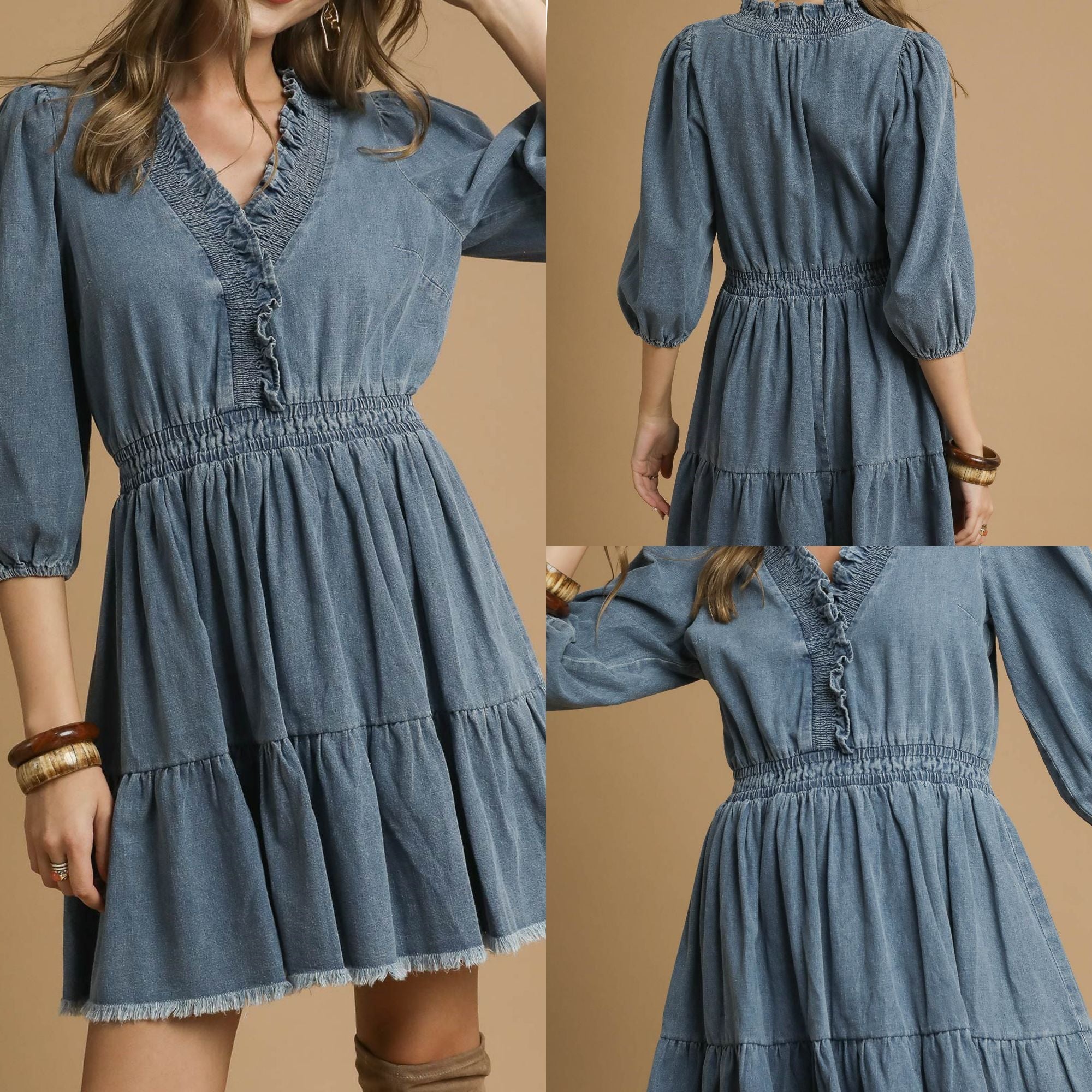 umgee Light Denim - Small - $ 58.00 Light Denim - Medium - $ 58.00 Light Denim - Large - $ 58.00 Qty. 1 2 3 4 5 6 7 8 9 10 Add to Cart Denim Ruffle Trim Tiered Mini Dress - is currently on backorder. You may still purchase now though and we'll ship as soon as more become available. Runs TTS/With A Flowy Fit! 75% Cotton 25% Polyester