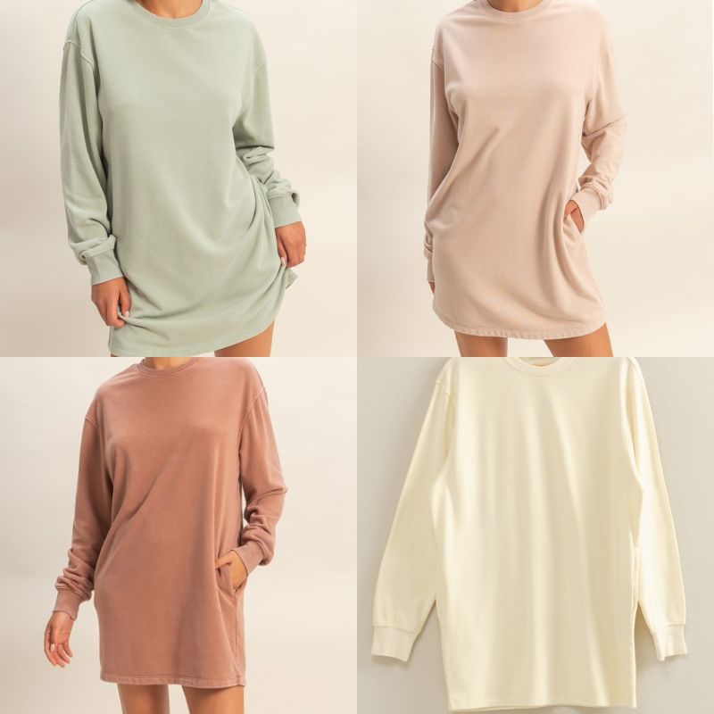 HYFVE Chestnut - Small - $ 32.00 Chestnut - Medium - $ 32.00 Chestnut - Large - $ 32.00 Cream - Small - $ 32.00 Cream - Medium - $ 32.00 Cream - Large - $ 32.00 Sage Green - Small - $ 32.00 Sage Green - Medium - $ 32.00 Sage Green - Large - $ 32.00 Dark Taupe - Small - $ 32.00 Dark Taupe - Medium - $ 32.00 Dark Taupe - Large - $ 32.00 Qty. 1 2 3 4 5 6 7 8 9 10 Add to Cart Mineral Washed Oversized Mini Sweatshirt Dress - is currently on backorder. You may still purchase now though and we'll ship as soon as more become available. Runs TTS/With A Flowy Fit! 80% Cotton 20% Polyester Contrast: 95% Cotton 5% Spandex
