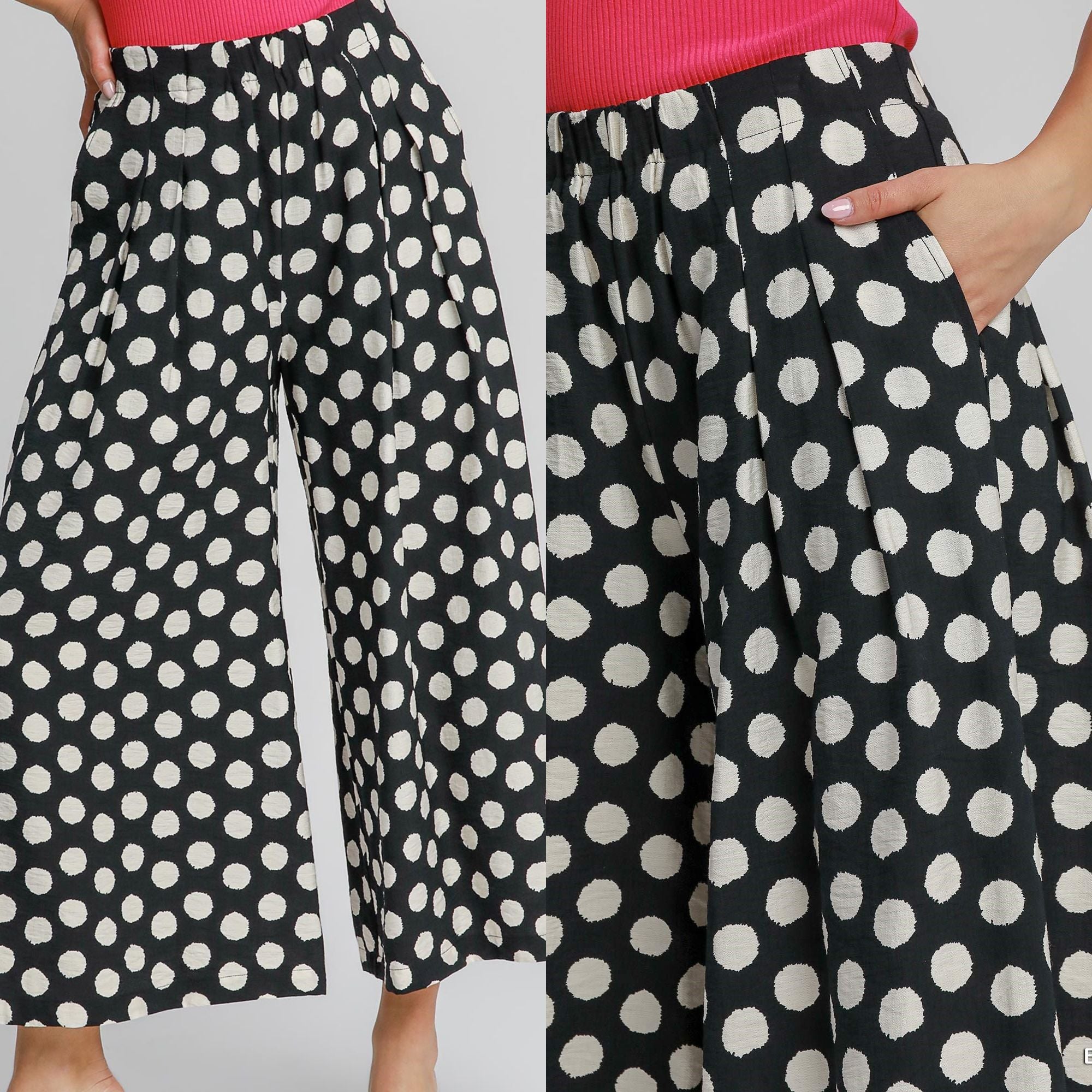 umgee Black - Small - $ 40.00 Black - Medium - $ 40.00 Black - Large - $ 40.00 Qty. 1 2 3 4 5 6 7 8 9 10 Add to Cart Polka Dot Wide Leg Pants - is currently on backorder. You may still purchase now though and we'll ship as soon as more become available. Runs TTS/With A Flowy Fit! 80% Viscose 20% Nylon Lining: 100% Polyester