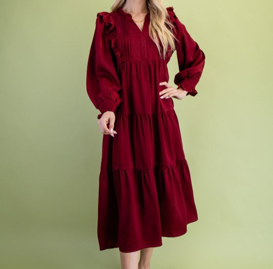 Gigio Burgundy - Small - $ 54.00 Burgundy - Medium - $ 54.00 Burgundy - Large - $ 54.00 Mocha - Small - $ 54.00 Mocha - Medium - $ 54.00 Mocha - Large - $ 54.00 Qty. 1 2 3 4 5 6 7 8 9 10 Add to Cart Tiered Long Sleeve Midi Dress With Pleated Front/Scalloped Ruffle - is currently on backorder. You may still purchase now though and we'll ship as soon as more become available. Runs TTS/With A Flowy Fit! 100% Polyester