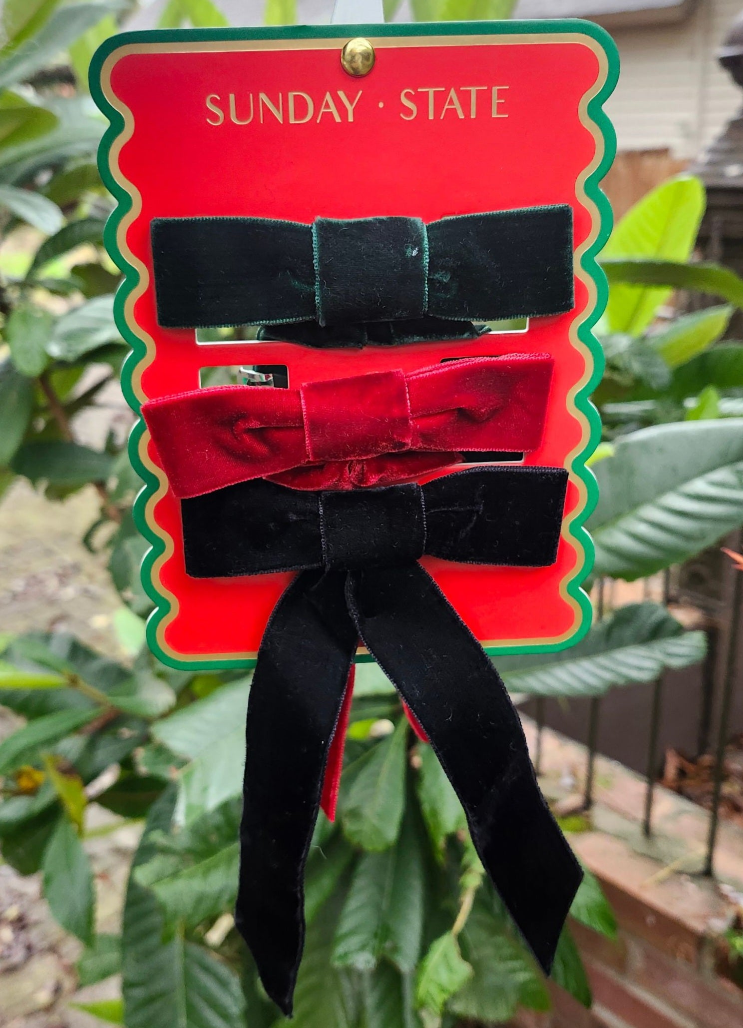 Sunday State Qty. 1 2 3 4 5 6 7 8 9 10 Add to Cart Velvet Hairbows - is currently on backorder. You may still purchase now though and we'll ship as soon as more become available. Set of 3 velvet hairbows!