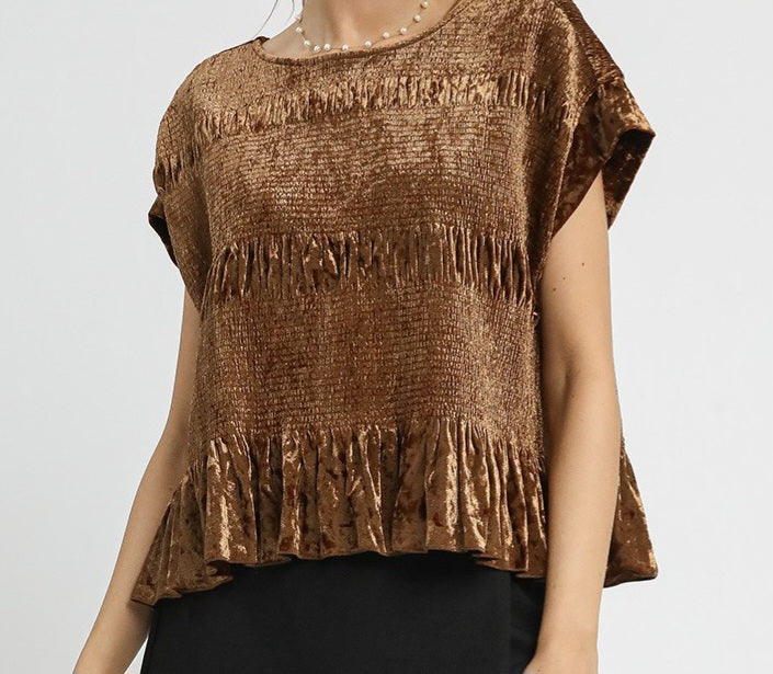 umgee Olive - Small - $ 46.00 Olive - Medium - $ 46.00 Olive - Large - $ 46.00 Brown - Small - $ 46.00 Brown - Medium - $ 46.00 Brown - Large - $ 46.00 Qty. 1 2 3 4 5 6 7 8 9 10 Add to Cart Velvet Ruffle Hem Smocked Top - is currently on backorder. You may still purchase now though and we'll ship as soon as more become available. Runs TTS/With A Flowy Fit! 95% Polyester 5% Spandex